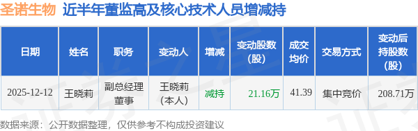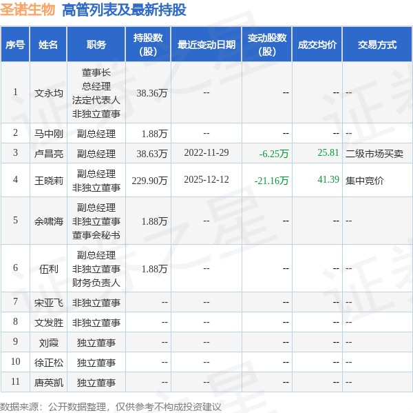 圣诺生物的高管列表及最新持股情况如下: