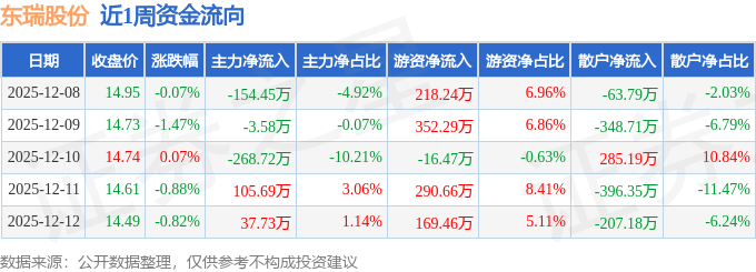 资金流向数据方面,本周东瑞股份主力资金合计净流出283.33万元,游资资金合计净流入1014.17万元,散户资金合计净流出730.84万元。本周资金流向一览见下表:
