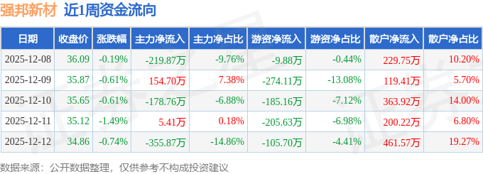 资金流向数据方面,本周强邦新材主力资金合计净流出594.39万元,游资资金合计净流出780.48万元,散户资金合计净流入1374.87万元。本周资金流向一览见下表: