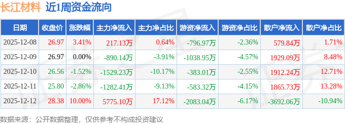 资金流向数据方面,本周长江材料主力资金合计净流入2290.44万元,游资资金合计净流出4885.29万元,散户资金合计净流入2594.85万元。本周资金流向一览见下表: