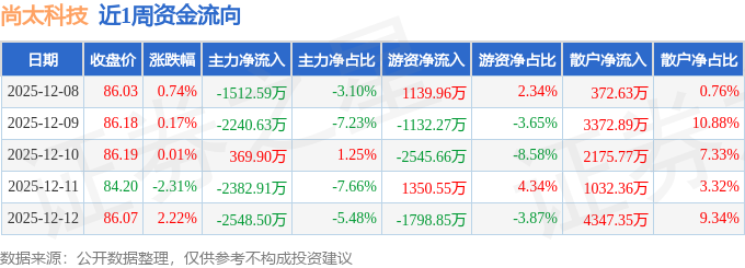 资金流向数据方面,本周尚太科技主力资金合计净流出8314.72万元,游资资金合计净流出2986.28万元,散户资金合计净流入1.13亿元。本周资金流向一览见下表: