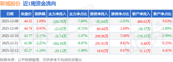 资金流向数据方面,本周联域股份主力资金合计净流出708.11万元,游资资金合计净流入518.49万元,散户资金合计净流入189.62万元。本周资金流向一览见下表:
