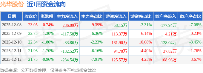 资金流向数据方面,本周光华股份主力资金合计净流出282.4万元,游资资金合计净流入437.4万元,散户资金合计净流出154.99万元。本周资金流向一览见下表: