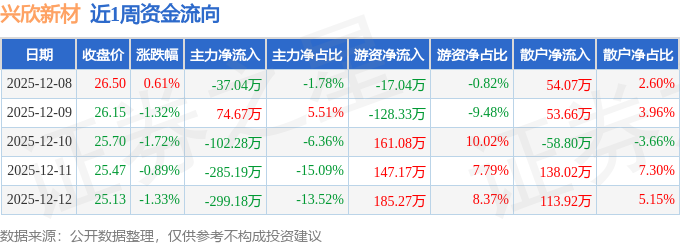 资金流向数据方面,本周兴欣新材主力资金合计净流出649.02万元,游资资金合计净流入348.15万元,散户资金合计净流入300.87万元。本周资金流向一览见下表: