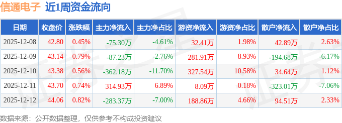 资金流向数据方面,本周信通电子主力资金合计净流出493.15万元,游资资金合计净流入838.8万元,散户资金合计净流出345.65万元。本周资金流向一览见下表: