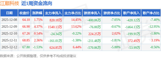 资金流向数据方面,本周江顺科技主力资金合计净流入2799.82万元,游资资金合计净流出1034.15万元,散户资金合计净流出1765.67万元。本周资金流向一览见下表: