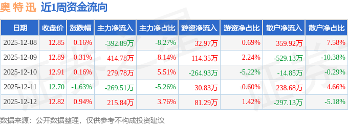 资金流向数据方面,本周奥 特 迅主力资金合计净流入248.0万元,游资资金合计净流出5.49万元,散户资金合计净流出242.51万元。本周资金流向一览见下表: