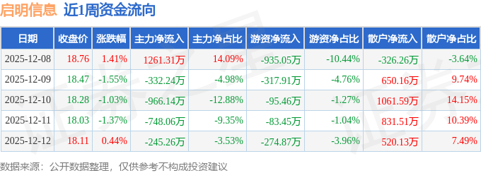 资金流向数据方面,本周启明信息主力资金合计净流出1030.39万元,游资资金合计净流出1706.74万元,散户资金合计净流入2737.13万元。本周资金流向一览见下表: