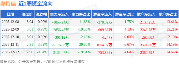 资金流向数据方面,本周奥特佳主力资金合计净流出1.33亿元,游资资金合计净流入2744.74万元,散户资金合计净流入1.06亿元。本周资金流向一览见下表: