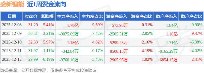 资金流向数据方面,本周盛新锂能主力资金合计净流入1.05亿元,游资资金合计净流入1.48亿元,散户资金合计净流出2.53亿元。本周资金流向一览见下表: