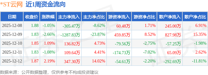 资金流向数据方面,本周*ST云网主力资金合计净流出999.55万元,游资资金合计净流入211.42万元,散户资金合计净流入788.13万元。本周资金流向一览见下表: