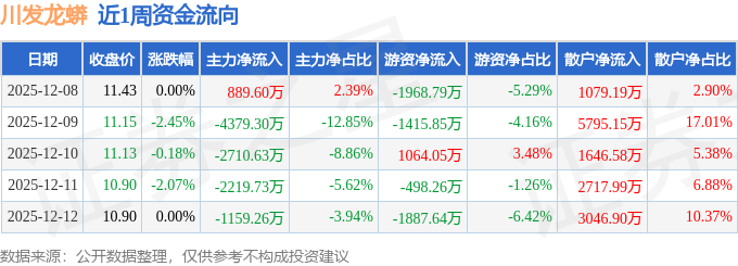 资金流向数据方面,本周川发龙蟒主力资金合计净流出9579.32万元,游资资金合计净流出4706.5万元,散户资金合计净流入1.43亿元。本周资金流向一览见下表: