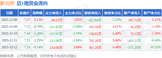 资金流向数据方面,本周新北洋主力资金合计净流出407.8万元,游资资金合计净流入973.18万元,散户资金合计净流出565.37万元。本周资金流向一览见下表: