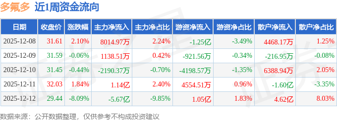 资金流向数据方面,本周多氟多主力资金合计净流出3.84亿元,游资资金合计净流出2524.81万元,散户资金合计净流入4.09亿元。本周资金流向一览见下表: