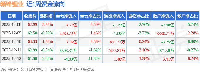 资金流向数据方面,本周赣锋锂业主力资金合计净流入1.72亿元,游资资金合计净流入312.51万元,散户资金合计净流出1.75亿元。本周资金流向一览见下表: