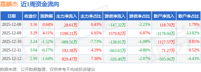 资金流向数据方面,本周嘉麟杰主力资金合计净流入2059.11万元,游资资金合计净流入304.44万元,散户资金合计净流出2363.56万元。本周资金流向一览见下表: