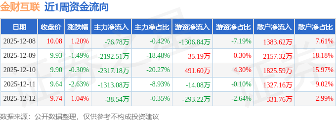 资金流向数据方面,本周金财互联主力资金合计净流出5938.1万元,游资资金合计净流出1087.35万元,散户资金合计净流入7025.45万元。本周资金流向一览见下表: