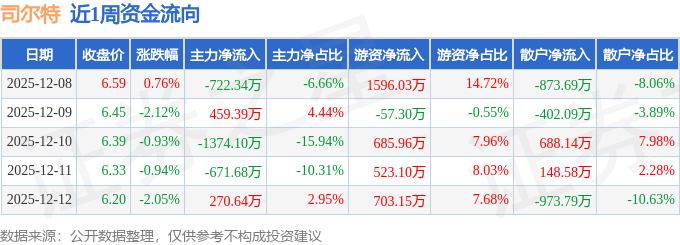 资金流向数据方面,本周司尔特主力资金合计净流出2038.09万元,游资资金合计净流入3450.94万元,散户资金合计净流出1412.85万元。本周资金流向一览见下表: