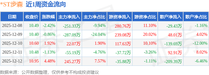 资金流向数据方面,本周*ST步森主力资金合计净流出326.27万元,游资资金合计净流入563.86万元,散户资金合计净流出237.6万元。本周资金流向一览见下表: