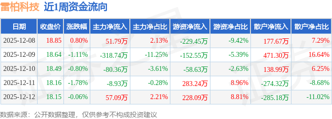 证券之星消息,截至2025年12月12日收盘,雷柏科技(002577)报收于18.15元,较上周的18.7元下跌2.94%。本周,雷柏科技12月9日盘中最高价报18.94元。12月12日盘中最低价报18.02元。雷柏科技当前最新总市值51.14亿元,在计算机设备板块市值排名48/84,在两市A股市值排名3254/5170。