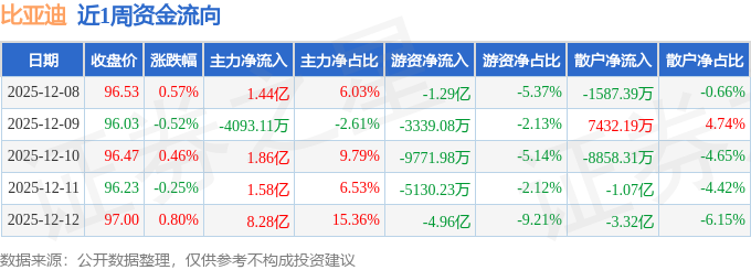 资金流向数据方面,本周比亚迪主力资金合计净流入12.76亿元,游资资金合计净流出8.07亿元,散户资金合计净流出4.69亿元。本周资金流向一览见下表: