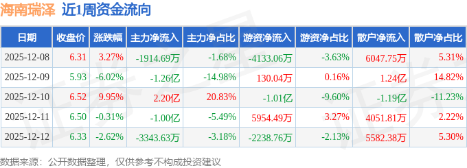 资金流向数据方面,本周海南瑞泽主力资金合计净流出5806.99万元,游资资金合计净流出1.04亿元,散户资金合计净流入1.62亿元。本周资金流向一览见下表:
