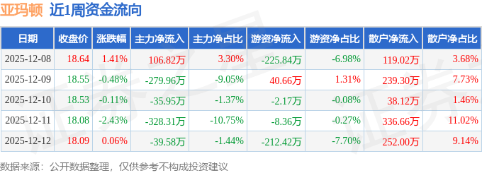 资金流向数据方面,本周亚玛顿主力资金合计净流出576.98万元,游资资金合计净流出408.12万元,散户资金合计净流入985.1万元。本周资金流向一览见下表: