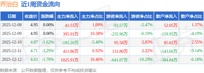 资金流向数据方面,本周乔治白主力资金合计净流入1694.01万元,游资资金合计净流出743.22万元,散户资金合计净流出950.78万元。本周资金流向一览见下表: