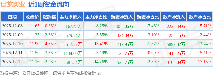 资金流向数据方面,本周世龙实业主力资金合计净流入855.25万元,游资资金合计净流出1949.91万元,散户资金合计净流入1094.66万元。本周资金流向一览见下表: