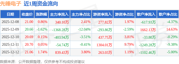 资金流向数据方面,本周先锋电子主力资金合计净流出647.43万元,游资资金合计净流入1988.76万元,散户资金合计净流出1341.33万元。本周资金流向一览见下表: