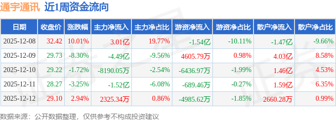 资金流向数据方面,本周通宇通讯主力资金合计净流出3.59亿元,游资资金合计净流出2.29亿元,散户资金合计净流入5.88亿元。本周资金流向一览见下表: