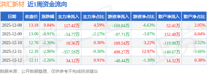 资金流向数据方面,本周洪汇新材主力资金合计净流出250.46万元,游资资金合计净流入291.82万元,散户资金合计净流出41.36万元。本周资金流向一览见下表:
