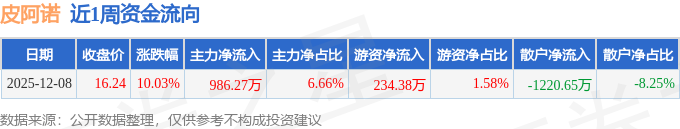 资金流向数据方面,本周皮阿诺主力资金合计净流入986.27万元,游资资金合计净流入234.38万元,散户资金合计净流出1220.65万元。本周资金流向一览见下表: