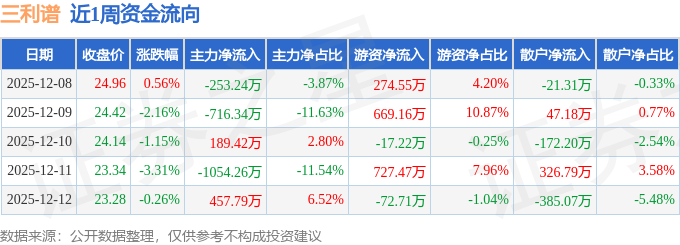资金流向数据方面,本周三利谱主力资金合计净流出1376.64万元,游资资金合计净流入1581.25万元,散户资金合计净流出204.61万元。本周资金流向一览见下表: