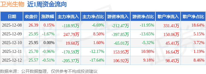 资金流向数据方面,本周卫光生物主力资金合计净流出227.51万元,游资资金合计净流出414.47万元,散户资金合计净流入641.98万元。本周资金流向一览见下表: