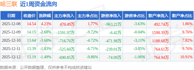 资金流向数据方面,本周哈三联主力资金合计净流出3054.63万元,游资资金合计净流出1754.73万元,散户资金合计净流入4809.36万元。本周资金流向一览见下表: