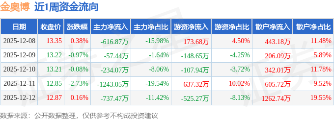 资金流向数据方面,本周金奥博主力资金合计净流出2888.89万元,游资资金合计净流入29.13万元,散户资金合计净流入2859.75万元。本周资金流向一览见下表: