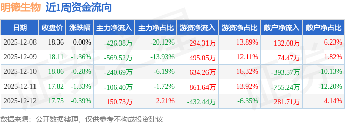 沪深股通持股方面,截止2025年12月12日收盘,明德生物深股通持股数为75.61万股,占流通股比为48.0%。