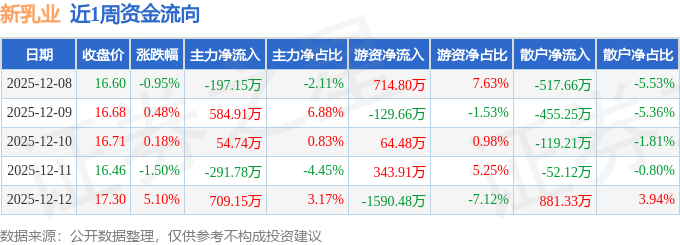 资金流向数据方面,本周新乳业主力资金合计净流入859.87万元,游资资金合计净流出596.95万元,散户资金合计净流出262.92万元。本周资金流向一览见下表: