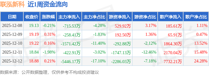 资金流向数据方面,本周联泓新科主力资金合计净流出8414.44万元,游资资金合计净流出3603.63万元,散户资金合计净流入1.2亿元。本周资金流向一览见下表: