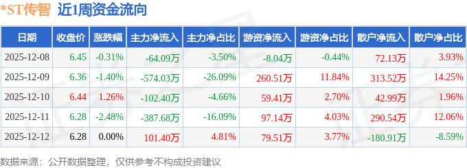资金流向数据方面,本周*ST传智主力资金合计净流出1026.8万元,游资资金合计净流入488.53万元,散户资金合计净流入538.27万元。本周资金流向一览见下表: