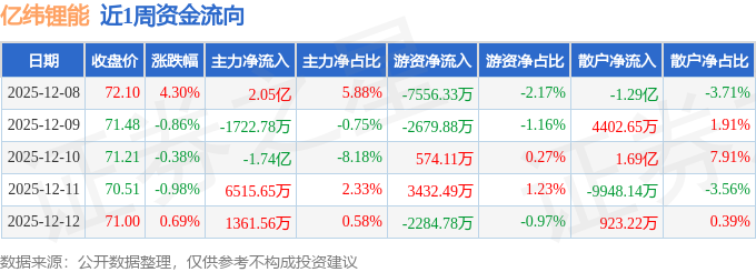 资金流向数据方面,本周亿纬锂能主力资金合计净流入9213.55万元,游资资金合计净流出8514.37万元,散户资金合计净流出699.18万元。本周资金流向一览见下表: