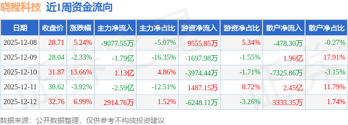 资金流向数据方面,本周晓程科技主力资金合计净流出3.87亿元,游资资金合计净流出877.53万元,散户资金合计净流入3.96亿元。本周资金流向一览见下表: