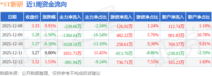 资金流向数据方面,本周*ST新研主力资金合计净流出2502.08万元,游资资金合计净流入790.75万元,散户资金合计净流入1711.33万元。本周资金流向一览见下表: