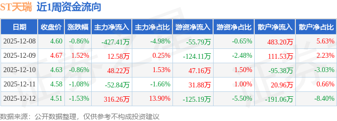资金流向数据方面,本周ST天瑞主力资金合计净流出103.2万元,游资资金合计净流出226.04万元,散户资金合计净流入329.24万元。本周资金流向一览见下表: