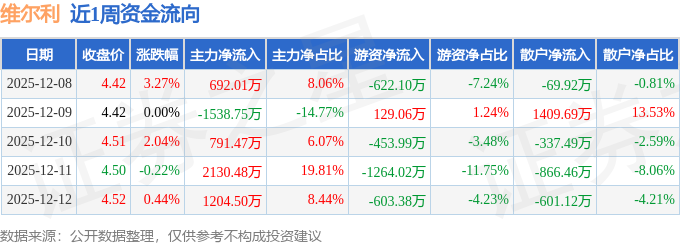 资金流向数据方面,本周维尔利主力资金合计净流入3279.72万元,游资资金合计净流出2814.41万元,散户资金合计净流出465.3万元。本周资金流向一览见下表: