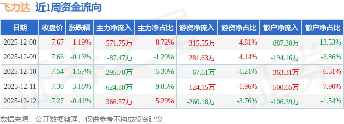 资金流向数据方面,本周飞力达主力资金合计净流出69.65万元,游资资金合计净流入393.54万元,散户资金合计净流出323.89万元。本周资金流向一览见下表: