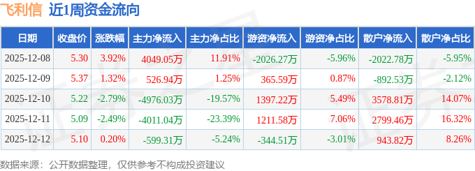 资金流向数据方面,本周飞利信主力资金合计净流出5010.39万元,游资资金合计净流入603.62万元,散户资金合计净流入4406.77万元。本周资金流向一览见下表: