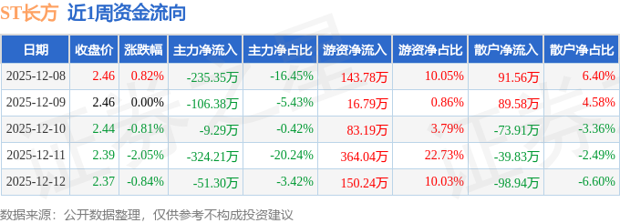 资金流向数据方面,本周ST长方主力资金合计净流出726.51万元,游资资金合计净流入758.04万元,散户资金合计净流出31.53万元。本周资金流向一览见下表: