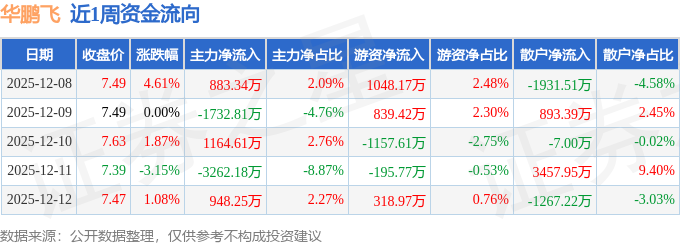 资金流向数据方面,本周华鹏飞主力资金合计净流出1998.8万元,游资资金合计净流入853.19万元,散户资金合计净流入1145.61万元。本周资金流向一览见下表: